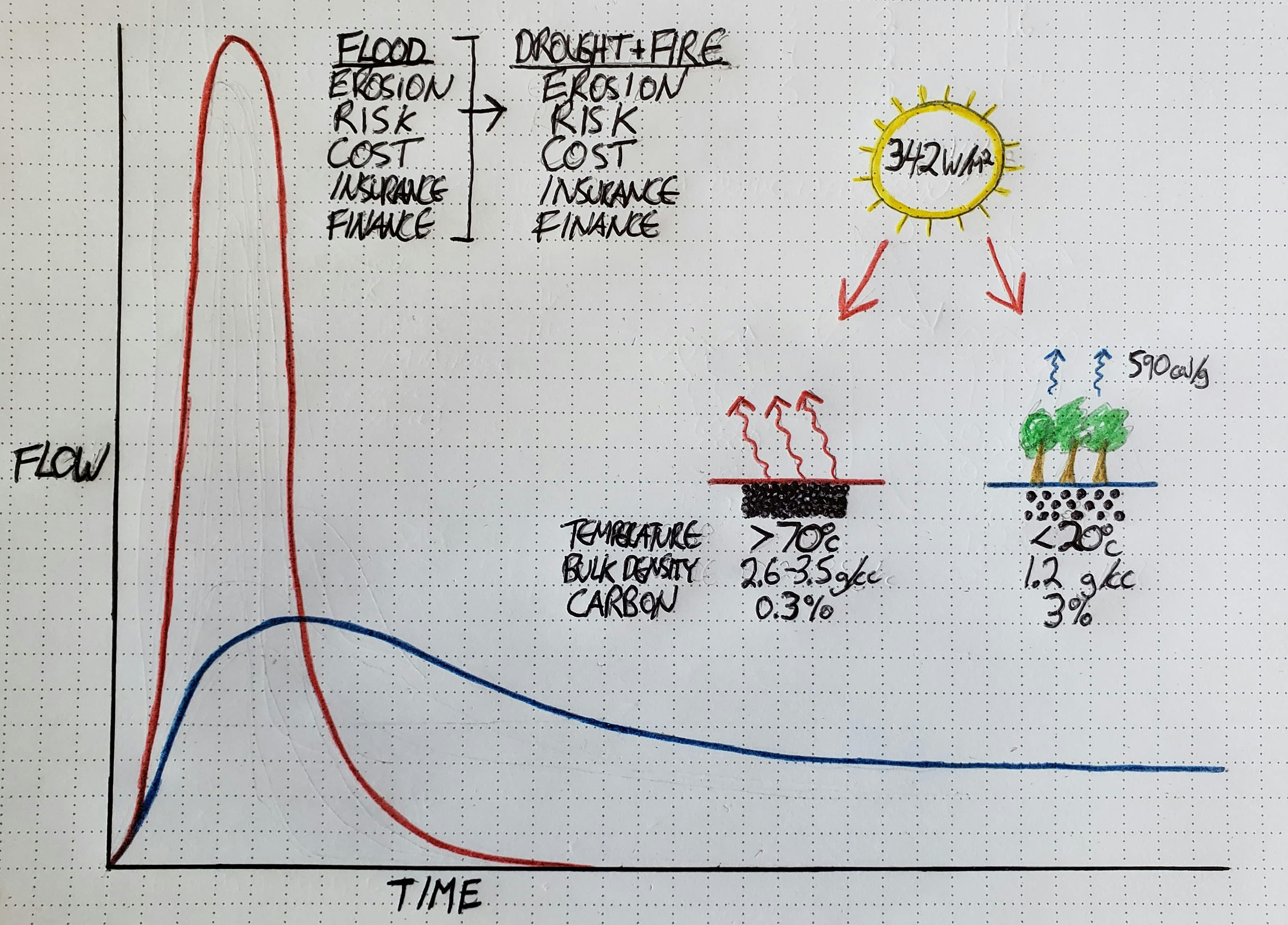 In the concrete landscape the water flow happens all at once, resulting in flooding and then the land quickly goes dry. There is only a short window for photosynthesis to occur after the last rains. This means drastically less photosynthetic cooling. The hardened bare earth absorbs and re-radiates heat from the sun. Both these impacts result in temperature rise and extreme climate.
